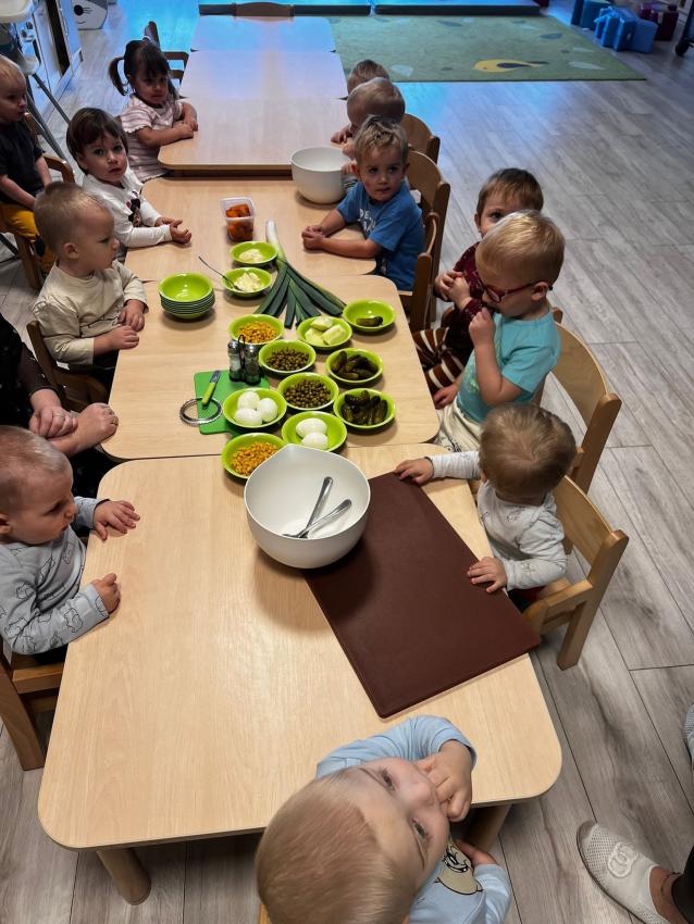 Dzieci na zajęciach "Zdrowie na talerzu" przygotowały sałatkę warzywną , kroiły marchewkę oraz ogórki . Widać ich skupienie i radość z samodzielnego tworzenia zdrowego posiłku. To wyjątkowa lekcja, która łączy edukację kulinarną z radością wspólnego działania.